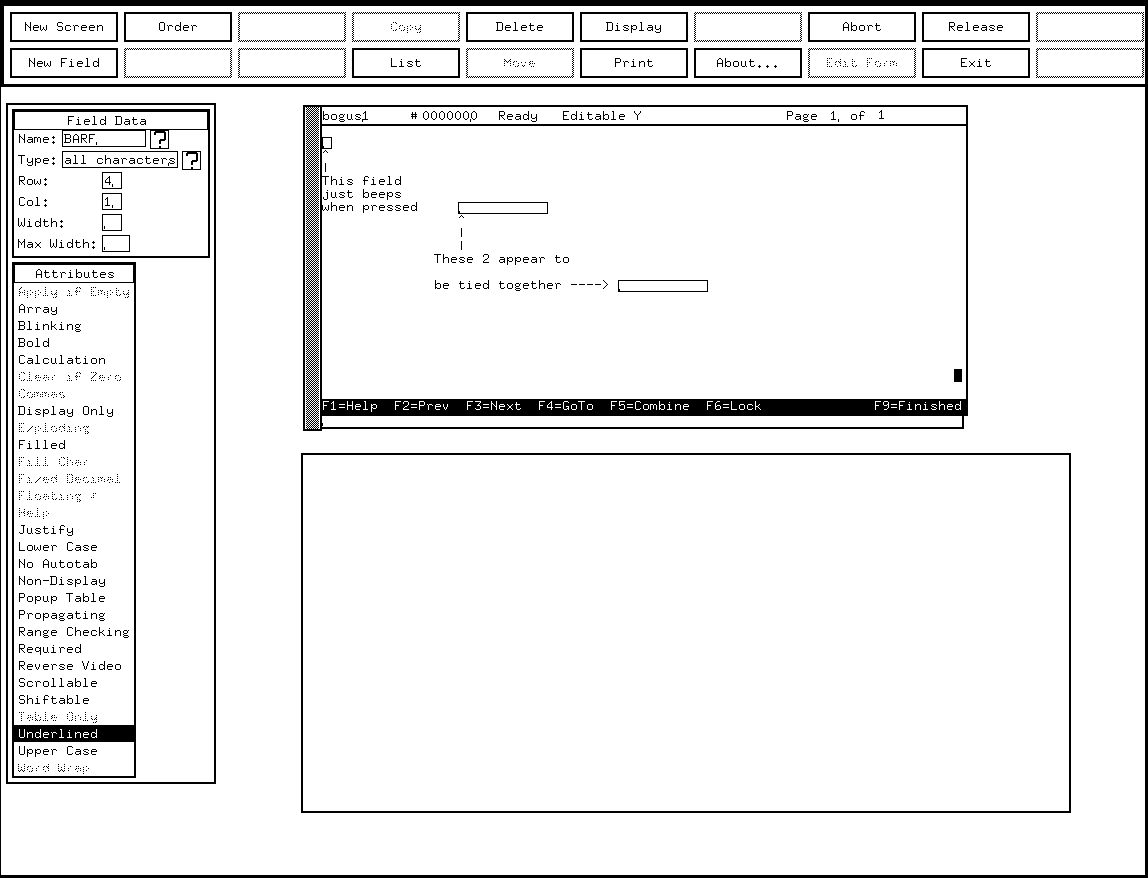 Later we will reference a field. This is an emulation of a data entry field in a PC-based windowing program. Each field contains numerous data structures, one of which is a widget. The widget window is the only part of the field the user actually sees. When a user selects a field with a mouse button the field window inverts.