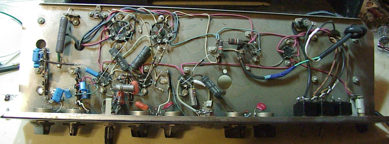 The whole shebang: At this point, everything is stock except: the trem section has been recapped; the power cord was replaced with a three wire cord; the second channel inputs have shielded cable. The original caps included Orange Drop[tm], Black Cat[tm], Astron[tm] (the metal body caps), General Instruments[tm] and mica disks. There's a hole for an extra tube, but I don't know what it would be used for. There are no extra holes on the panel for additional controls; perhaps the second channel could be replaced with a reverb. The through holes for wires had no grommets. The extra hole at the upper left was probably used for a different output transformer with wires coming out both sides. The currently unused switch at the lower right was a polarity switch before the power cord conversion to three wire.