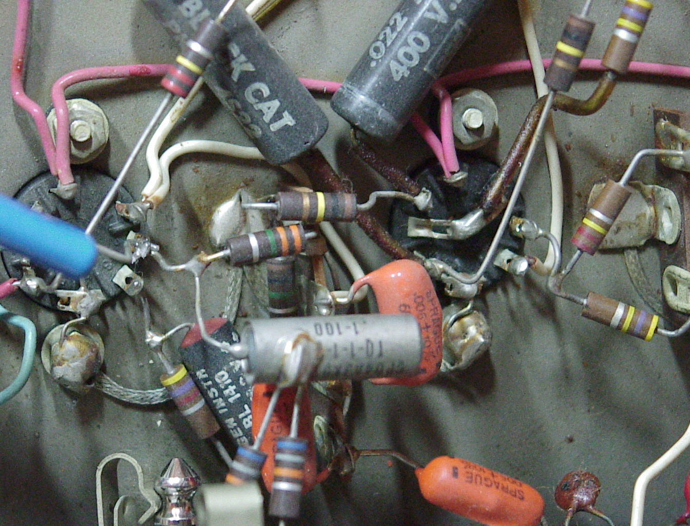 Signal path guts: Here's a closeup of most of the signal path and tremolo guts. This is classic, mass production, flying lead, point to point wiring from the 60s. As much as possible hangs directly off sockets, controls, and jacks, and the chassis is used as the main ground path. Components came standard with longer leads to facilitate just such construction; note the long resistor leads. The larger Xicon cap from the leftmost tube socket required a lead extension to reach the terminal strip the original cap reached. (I have since learned not to buy caps with leads this short!)