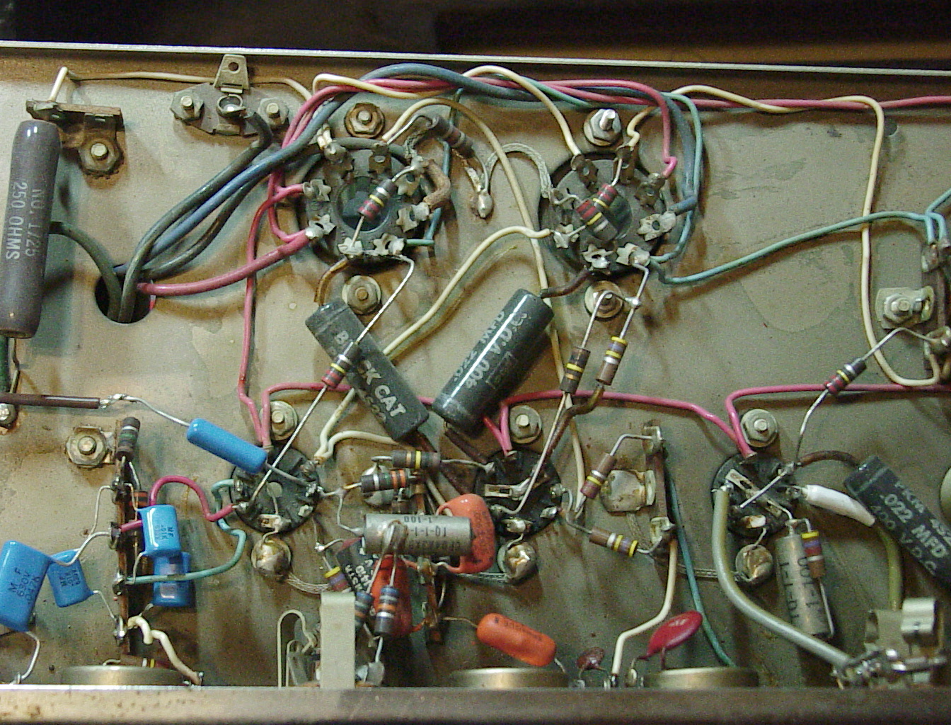 Ground details: Ground straps (braid) are used for some of the signal grounds. This amp has somewhat of a star ground system, using the chassis to connect the various subsections. Note the wire and braid soldered to the tube socket mounting bolts; this was to insure a good electrical ground for the socket shields. The terminal strip to the right is soldered to the chassis rather than bolted; other strips were bolted. Presumably this was because manufacturing chose to place terminal strips where no holes existed. The solder blob between the sockets is another terminal strip mount/ground. The body of the Astron cap in the lower middle is used instead of connecting to the lead at the end; there's no grounding there. (That cap is C104 on the schematic.)