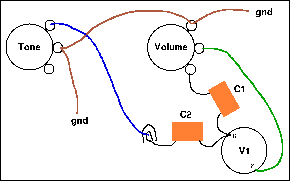 The modified circuit leaves things where they are as much as possible. The brown wire between the pots now goes to a grounded lug where it connects to the new capacitor. The blue lead was moved to the other side of the tone pot. Without this change, the pot would work backwards to the normal scheme; full treble would be counter-clockwise. The new wire is purple in the diagram; proper color coding would suggest blue wire for this, since it's closer to the plate than to the next stage's grid.