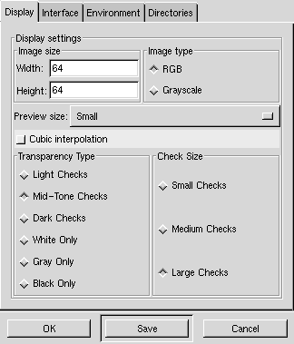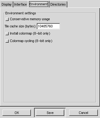 The Preferences dialog reads data from both the system gimprc and a user's personal .gimprc file. Saving the preferences updates the user's personal .gimprc file. Only settings actually changed in the Preferences dialog will be saved. This gives the system administrator an easy way to make global changes, but also means that behavior may suddenly change if a new version of the GIMP is installed.